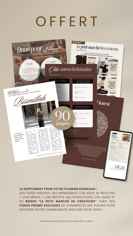 Très complet, il aide beaucoup à garder le rythme du ramadan ! J’aurai du le commander avant car il y a une partie avant jeûne très très intéressante. Tout y est il est très bien construit et magnifiquement bien réalisé ! J’aime beaucoup le design intérieur de chaque page, les rappels et explications, les duaas, les objectifs, les challenges etc Merci pour ce planeur qui m’aide beaucoup durant ce mois si important ! Qu’Allah vous préserve et vous récompense pour ce travail